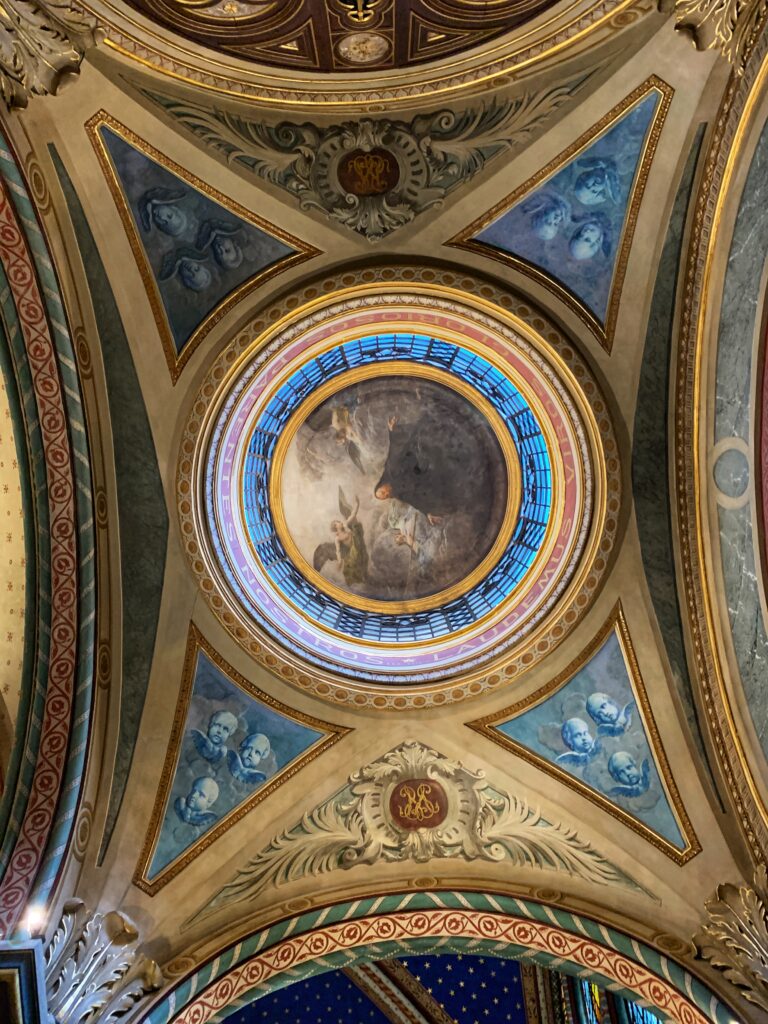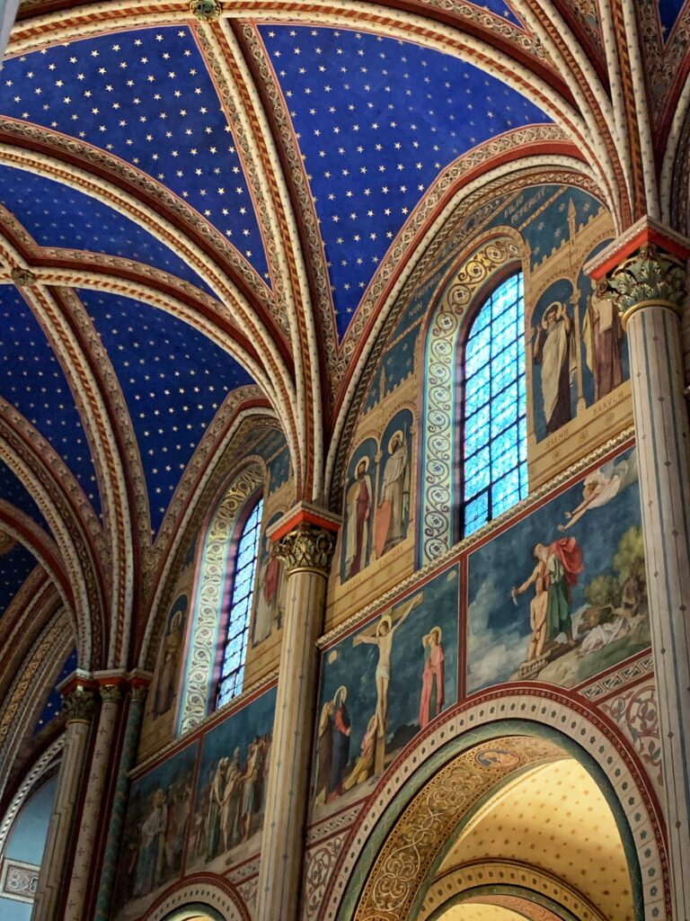Le style roman domine l’architecture du lieu. On aime lever les yeux au ciel et admirer la voûte reproduisant le ciel de nuit bleue profond et ses étoiles dorées. Ne manquez pas la remarquable nef aux croisées d’ogives. Les fresques sont signées par l’architecte Hyppolyte Flandrin, peintre français du 19ème siècle.